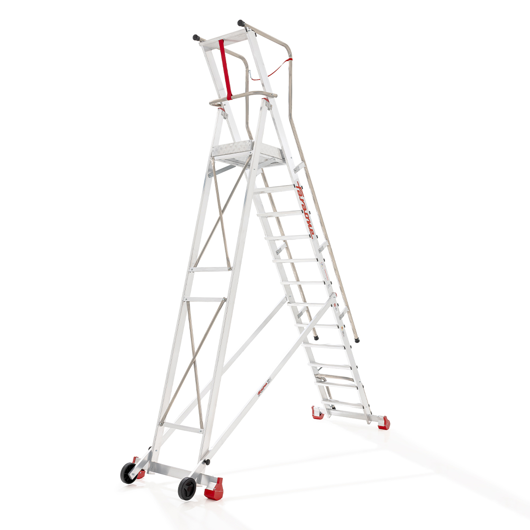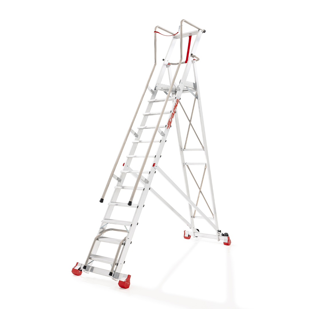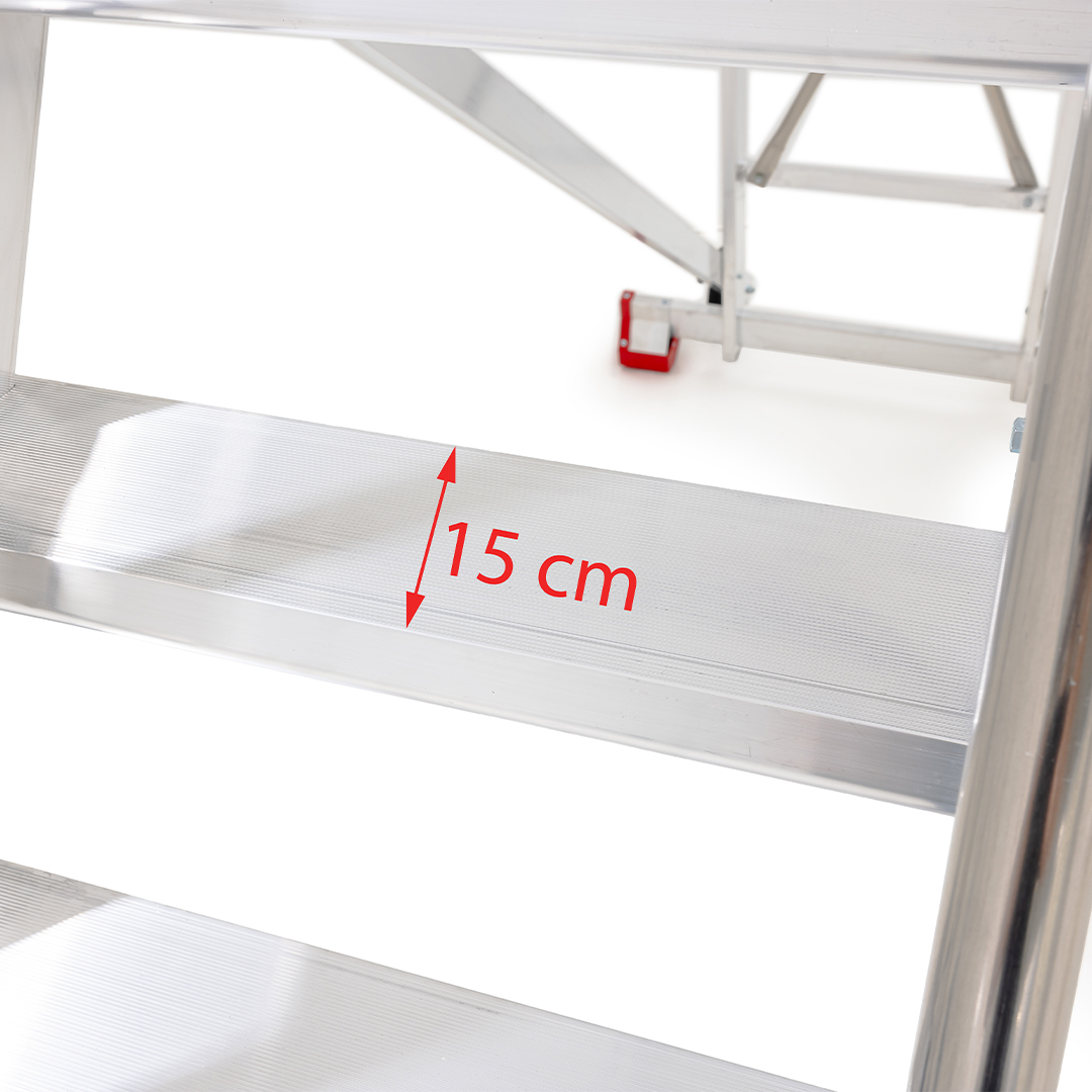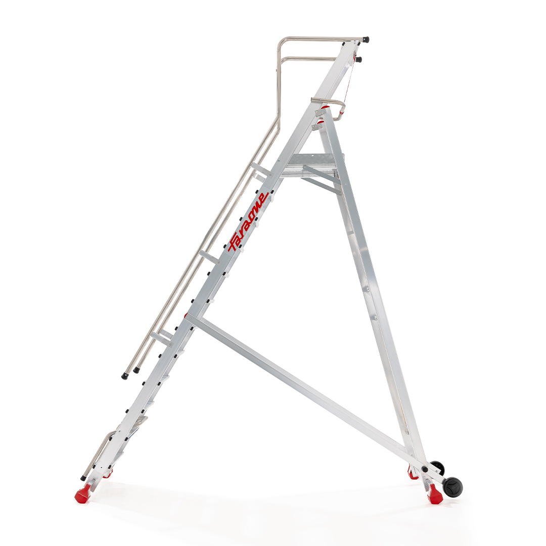 Podest magazynowy Faraone SMT to składana, aluminiowa konstrukcja do bezpiecznej pracy na wysokości w magazynach i zakładach. Wyposażony w ryflowane stopnie, barierki i stabilizatory.